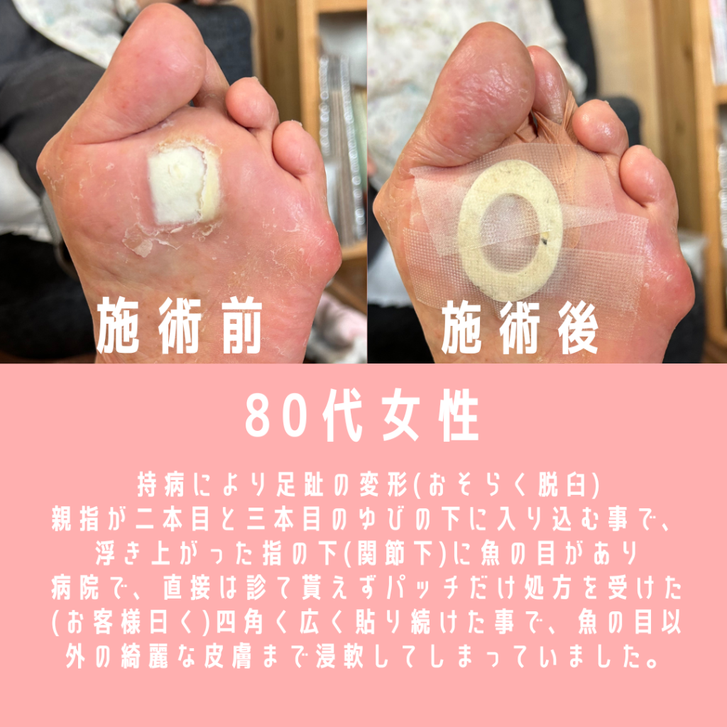 フットケアでご来店くださる方は、足裏の胼胝(たこ)や鶏眼(魚の目)、巻き爪の方が多く、それぞれの問題に対しケアを行い、その時には改善されます。
