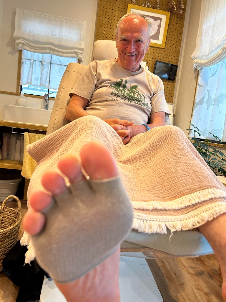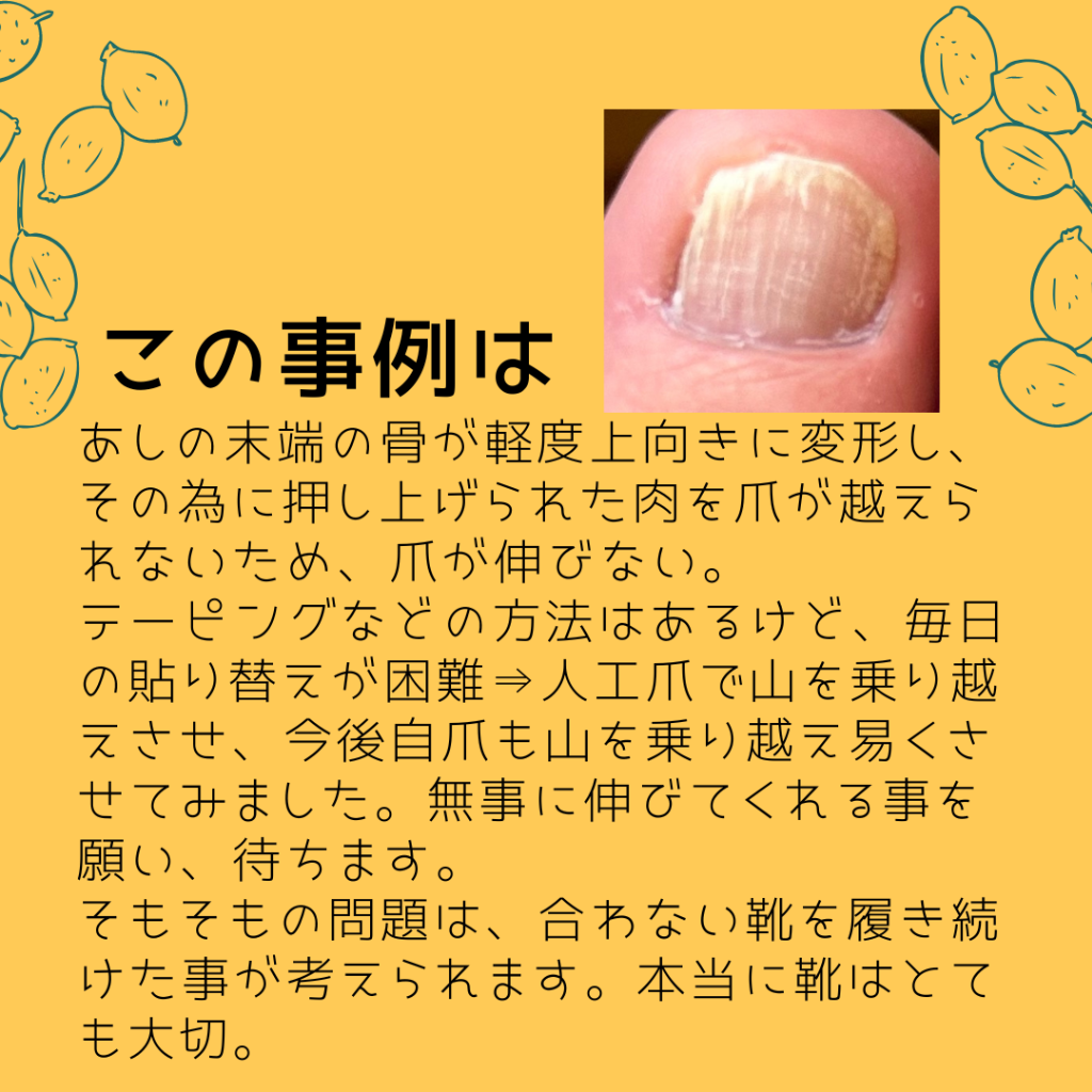 今回のようなお客様は、もともとの疾患がある事から、靴が合わない、姿勢が悪いことでどんどんと、膝や股関節、腰椎、胸椎まで影響し変形していきます。変形していく際にも、関節のずれ・歪みから緩みへとどんどん悪影響がでてきます。そのような状況であることは、専門的な知識がないお客様はわからず生活を送る事となり、どこかで専門職の関わりが必要となってきます。お客様には、まだまだこれから何十年と健康にご自身の足で歩いて欲しい。好きなことをいっぱい楽しんで、笑顔いっぱいの生活を送って欲しい。今回、当サロンを見つけて下さり、勇気をだしてご来店して下さって良かったなと私は思いました。