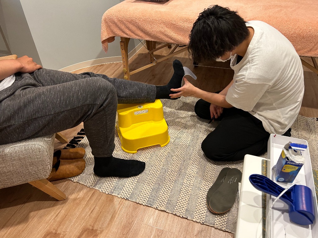 そんな時に、Instagramでfoot engineerの方を見つけ、お声をかけさせていただきました。彼は、現役の理学療法士で病院で勤務をされている方でした。まだお若い方なのですが、今後、独立したいと考えられていました。お話する中で、足の大切さや地域(松山)でのあしの大切さの意識がまだまだ浸透していない事など、共感できることも多く、できれば当サロンでお客様のご希望があれば訪問でインソールの作製と歩行姿勢のチェックをお願いできないかとお話をしたところ、快く承諾していただきました。