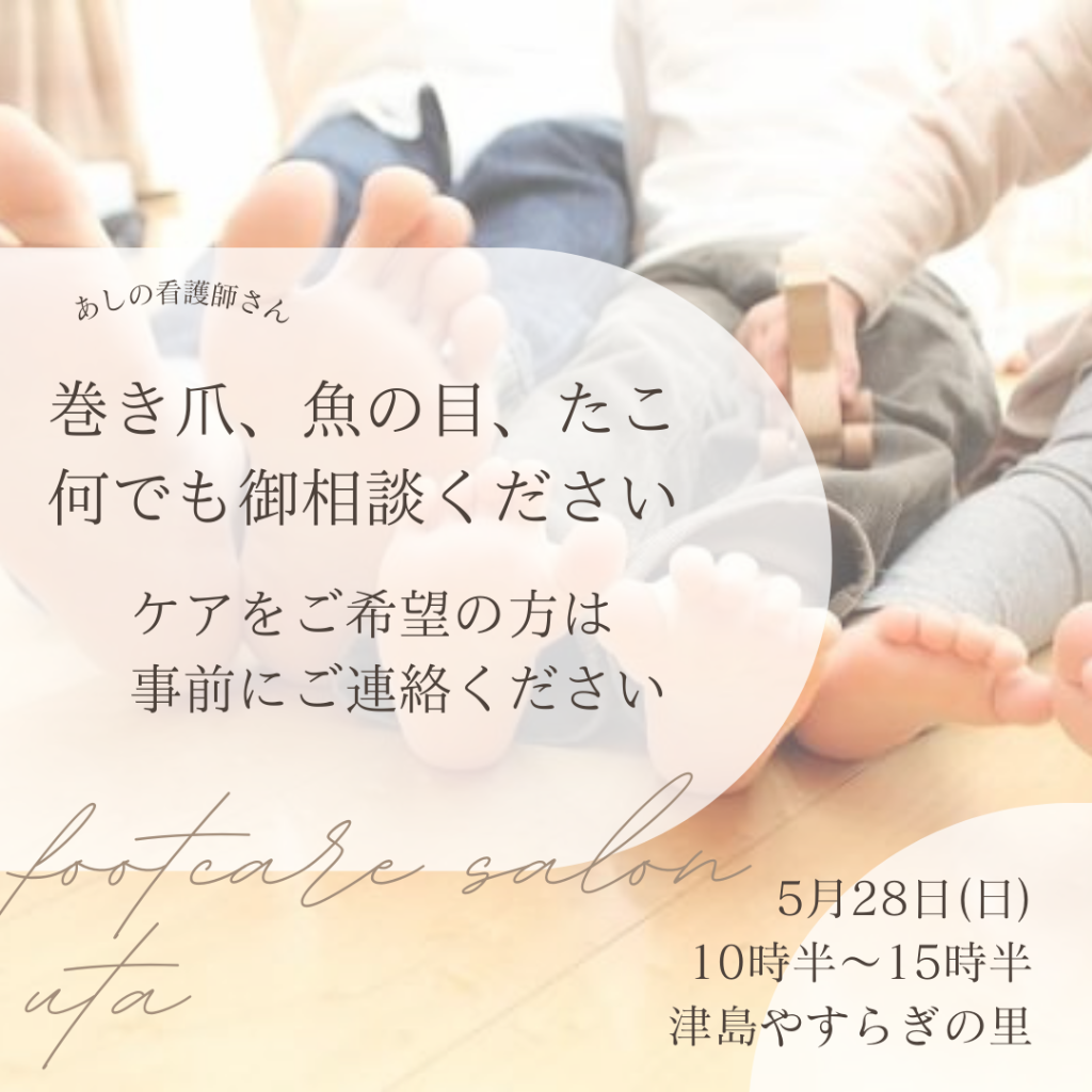 イベントでは毎回、巻き爪や魚の目などの角質ケアをご希望の方や、悩まれているかたのご相談もお受けいたします。松山市まで来れない方も、津島町でのイベントの際にぜひご相談ください。