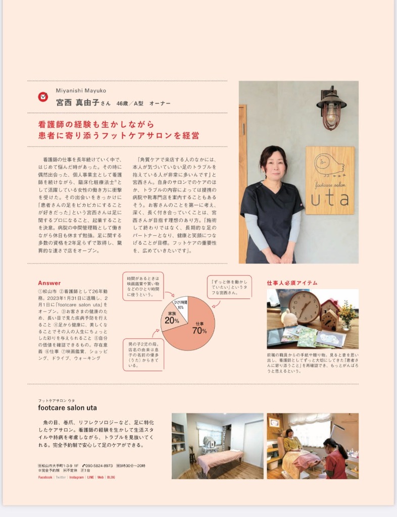 松山市だけではなく、愛媛県全域にフットケアを浸透し、足難民と呼ばれる方や今健康である方々へも予防的フットケアを日常とできるよう努力していこうと思っており、それらにより皆様が元気で、笑顔にみちた日々をおくれると自分自身も嬉しく思います。